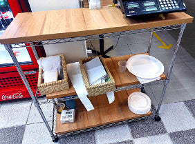 ORGANIZAÇÃO MÓVEL PARA REORGANIZAR CONFORME DEMANDA! Mesa metal com rodinhas 🔄 + 3 prateleiras madeira 25mm 🗄️ resistentes. Três níveis de armazenamento 🪵 móvel. Mova para onde precisar: 💪 utensílios, ingredientes, equipamentos. Compacta mas 🔢 útil. Reorganize operação conforme demanda! 📦Condição do item (1-5)=